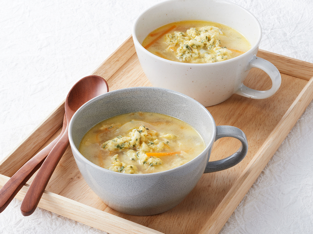 卵にチーズやパン粉を混ぜたものを流し入れることでふわふわに仕上がる、イタリア風のかきたま汁です。チャービルのやさしい香りをお楽しみください。