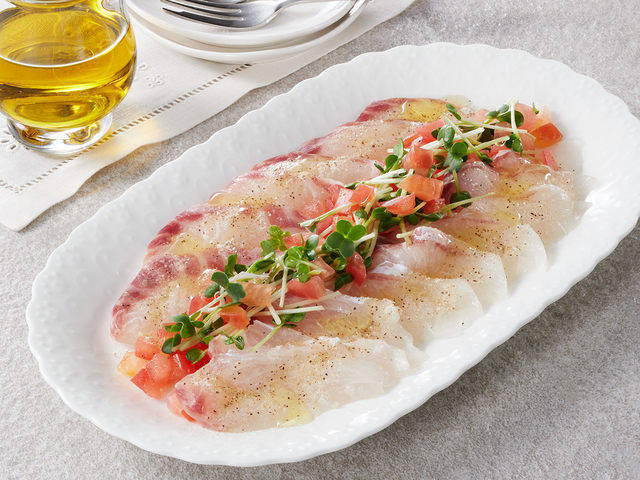 - 【1】鯛は薄いそぎ切りにし、器に並べます。レモンペッパーをまんべんなく振りかけます。