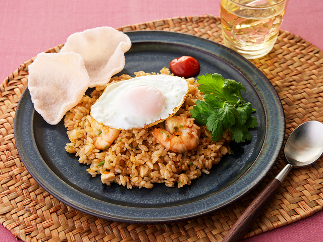 えびや野菜をごはんと一緒に炒めたインドネシアの料理です。インドネシアでは甘みのある調味料で味付けしますが、手に入りやすいナンプラー、醤油、オイスターソースで再現しました。