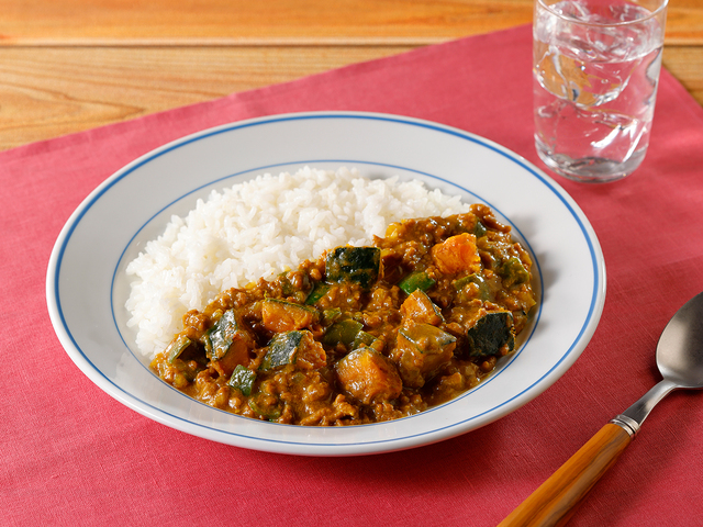 - 【2】耐熱ボウルに合いびき肉、【1】、水、ルウを入れて軽く混ぜます。ラップをふんわりかけて電子レンジ600Wで12分加熱してよく混ぜ、白飯とともに盛りつけます。