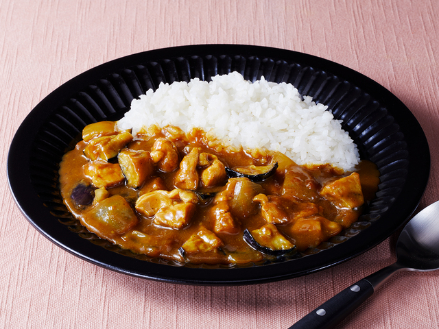 - 【2】鍋にサラダ油を熱し、玉ねぎ、にんにく大さじ1を入れて炒めます。鶏肉、なすを加えて炒めます。