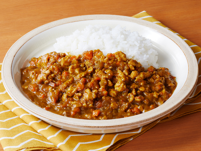 - 【2】鍋にサラダ油を熱し、しょうが大さじ1、玉ねぎを入れて、玉ねぎをあめ色になるまで炒めます。鶏ひき肉を加えて炒めます。肉に火が通ったら、にんじんを加えて炒めます。