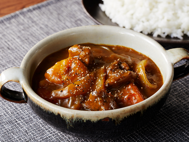 - 【4】いったん火を止めてルウを割り入れ溶かします。再び火をつけ、とろみが出るまで弱火で3分ほど煮込み、残りのブラックペッパーを加えます。