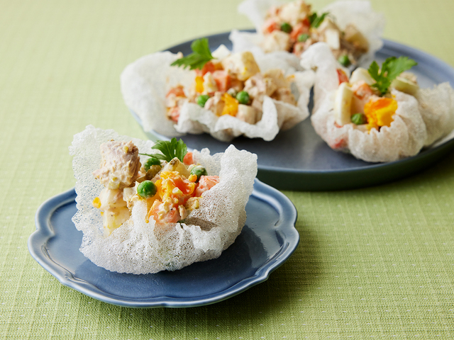 揚げたライスペーパーを器代わりに。丸ごと食べられるポテトサラダです。パーティーやおもてなしにもおすすめ。ポテトサラダ以外にも、お好みのおかずを盛りつけて。