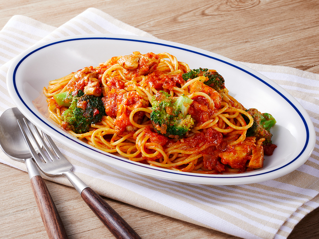 - 【4】別の鍋にたっぷりの湯を沸かし、1%の塩を加えてスパゲッティをゆでます。ゆで上がり1分前にブロッコリーを加えます。スパゲッティがゆで上がったら一緒にザルに上げ、【3】に加えて混ぜ合わせ、器に盛ります。