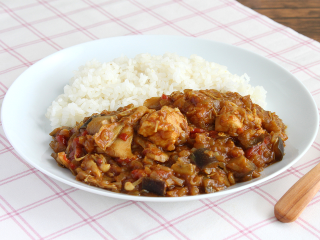 - 【2】鍋にサラダ油を熱し、おろしにんにく、きのこ類を炒めます。玉ねぎ、なす、トマト水煮缶、鶏肉、塩を入れてしっかりふたをして弱火で20分ほど煮ます。