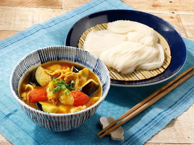 - 【3】麺つゆ、カレー粉を加えて具材に火が通ったら、トマトを加えてひと煮立ちさせ器に盛り、小口切りにした小ねぎをのせます。