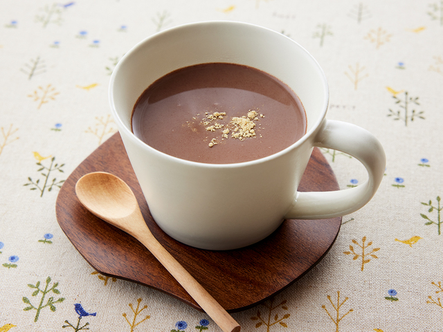 - 【1】耐熱性のマグカップにココアパウダー、砂糖、ジンジャーパウダーを入れてよく混ぜます。豆乳を少量加えて混ぜ、なめらかになったら残りの豆乳を加えます。