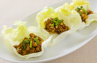 鍋に分量の水を入れて沸かし、塩、ごま油を加える。この中に食べやすく切ったキャベツを加え20秒程度茹で、手早く水気を切る。器にキャベツを盛り、1.をかける。
