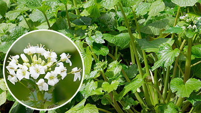 寿司などに使われているおろしわさびは、ごつごつした円柱形の根茎の部分をすりおろしたものです。この根茎から上に見ていくと、葉柄という葉を支えている部分が伸び、その先にハート形の大きな葉が付いています。葉柄ととともに花茎が上に伸びその先に、冬から初夏にかけ小さな十字状の白い花を咲かせます。その可憐な色形から、刺激のある辛さを想像できません。