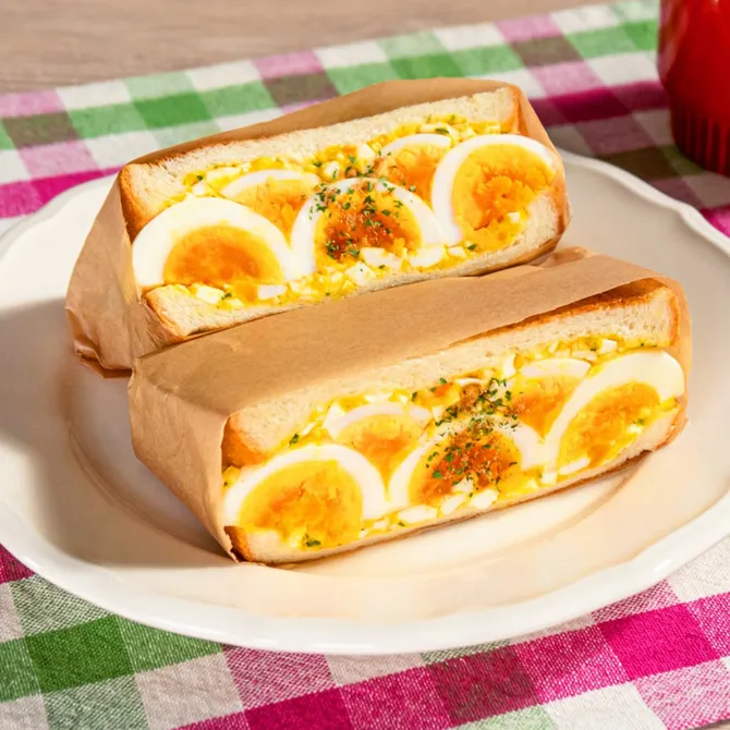1の食パンにハーブマヨソースを小さじ1/2ずつ塗る。食パン2枚にたまごサラダを1/4量ずつのせて広げる。たまごサラダを塗った食パンの中央に縦2等分に切った半熟ゆで卵を3切れずつのせ、間に縦4等分に切った半熟ゆで卵を2切れずつのせる。隙間に残りのたまごサラダを1/4量ずつのせ、残りの食パン2枚ではさみ、ラップで包む。5分ほどそのままおいて馴染ませ、半分に切る。