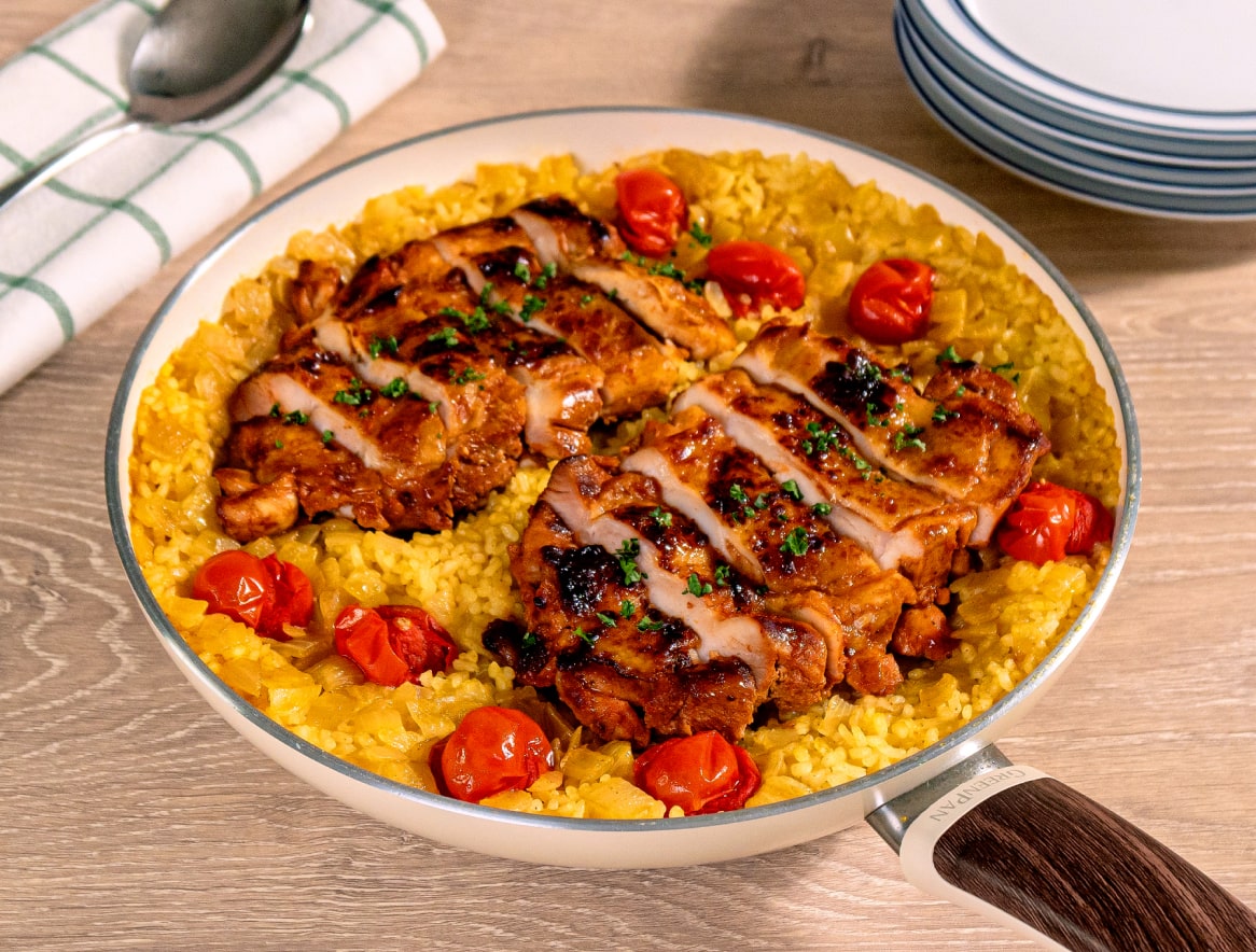 そのままのフライパンに残りのサラダ油(大さじ1/2)、玉ねぎを入れて透き通るまで中火で炒める。米を加えて米が透き通るまで炒める。S&Bスティックスパイス ガラムマサラ(小さじ1/2)、S&Bスティックスパイス ターメリック(小さじ1/2)を加えてなじむまで炒める。塩、水を加え、混ぜて平らにならす。3の鶏肉を戻し入れ、ミニトマトを加え、煮立ったらふたをして弱火で15分加熱する。火を止めてそのまま10分蒸らす。